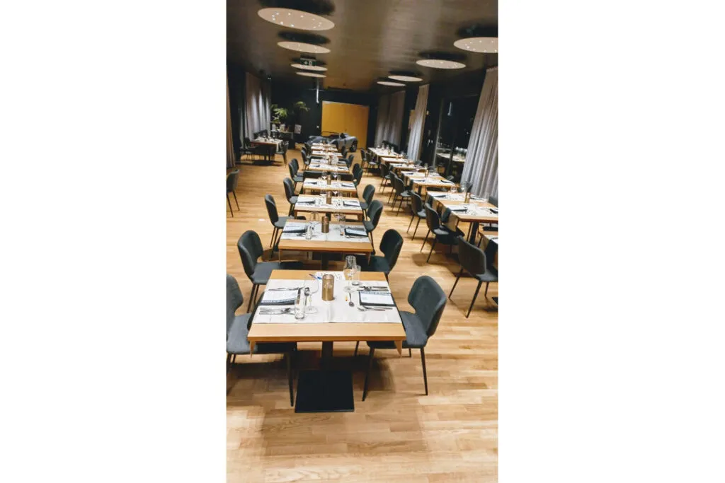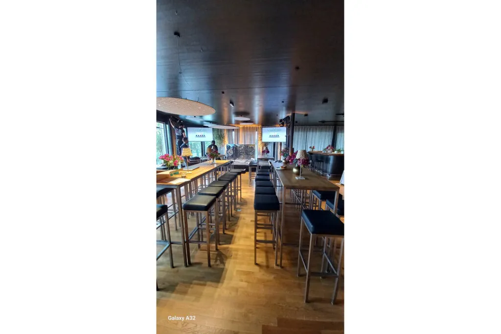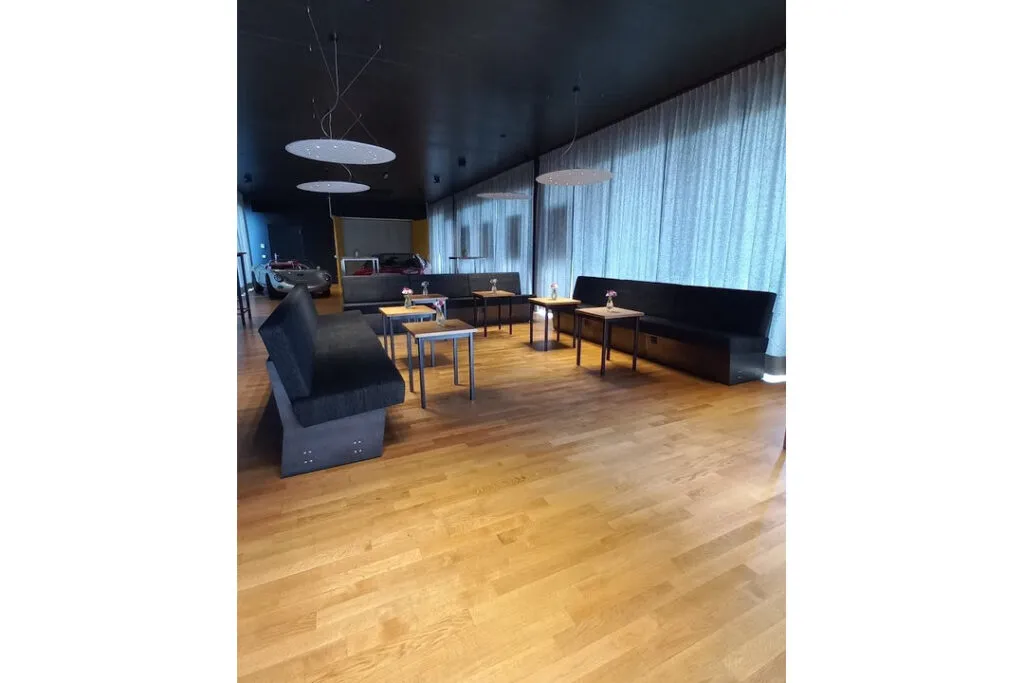 Die Eventlocation mit großer Bar bietet einen Großraumlift für Autos, Transport von Equipment und Technik. Konzipiert für 60 Personen um in die Autoebenen zu gelangen. Der Eventbereich allein bietet indoor Platz für 120 Personen im Bankettsetting und bis zu 200 Personen im Cocktailsetting während die umliegenden drei Terrassen mit etwa 150m² zusätzlichen Raum und vielfältige Gestaltungsmöglichkeiten bieten.