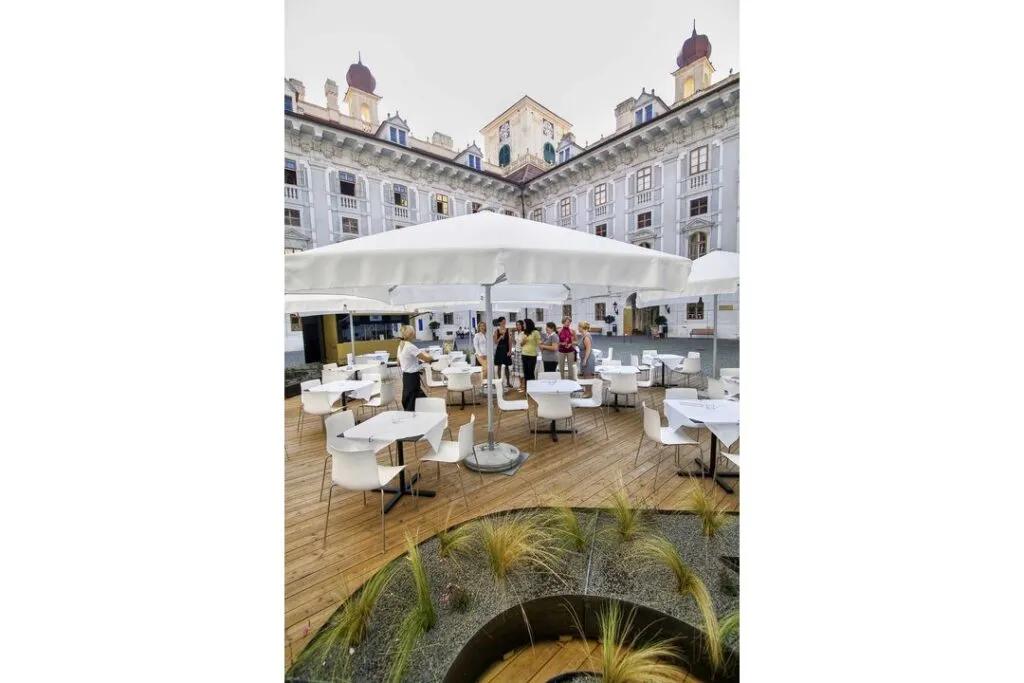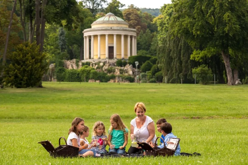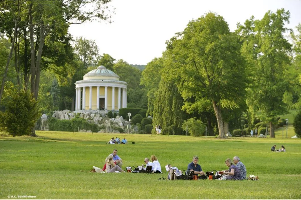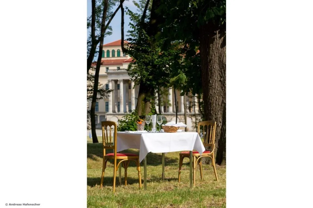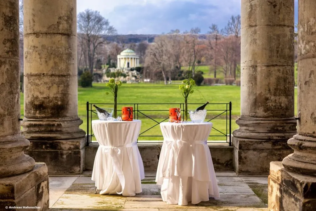 Direkt vom Haydnsaal öffnen sich die Türen zum Gartensaal, der wiederum die Verbindung zum Schlosspark bildet. Bei wärmeren Temperaturen tummeln sich die Gäste im vorgelagerten Portikus, von dem aus sich ein einmaliger Blick auf den Leopoldinentempel im Schlosspark bietet.