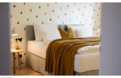 Das denkmalgeschützte Gästehaus „Zum Oberjäger“ liegt im neu adaptierten Arboretum im idyllischen Park von Schloss Lackenbach. Für die Übernachtungen stehen insgesamt vier Doppelzimmer, eine Suite und eine Juniorsuite zur Verfügung. Die Räumlichkeiten des Gästehauses spiegeln Fauna und Flora der Region in all ihren Facetten wieder: Libellen, Vögel, Schmetterlinge oder Rosen zieren die Wände, zarte bis kräftige Farbtöne bestimmen die Räume und bleiben dabei wunderbar dezent. Das Interieur kombiniert Geschichte mit modernen Elementen, unter den Möbelstücken finden sich historische Unikate aus der „Sammlung Privatstiftung Esterhazy“. Jedes Themenzimmer ist somit einzigartig in seiner Gestaltung und in seinem Flair. Kulinarisches Zentrum des Gästehauses ist der Kochsalon. Hier wird das Frühstück serviert. Hier wird aber auch gekocht. Denn die gut ausgestattete Küche ist groß genug, um Hochseminare abzuhalten. Oder um sich abends selbst eine Kleinigkeit zuzubereiten.