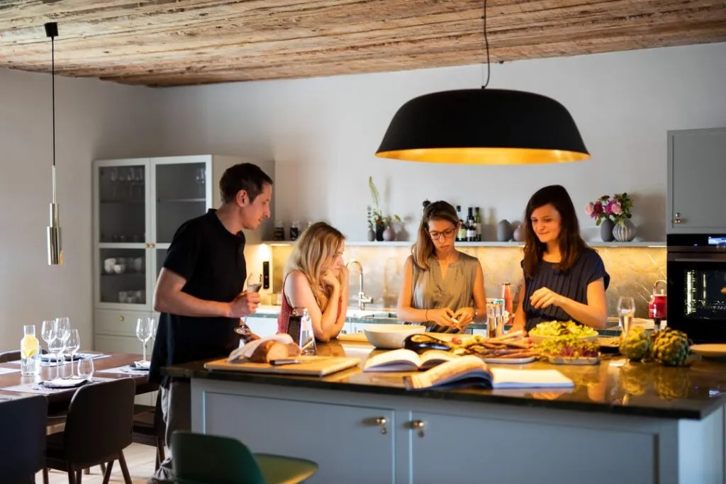 Modernes Design in historischen Räumen. 6 großzügige Gästezimmer und Suiten und ein großer Kochsalon bieten insgesamt 14 Personen