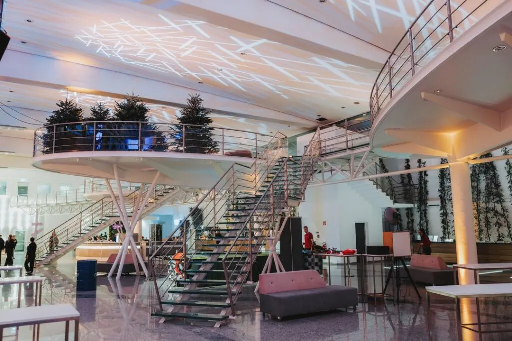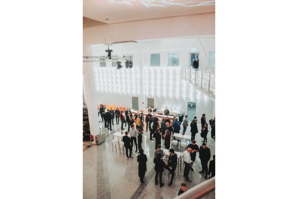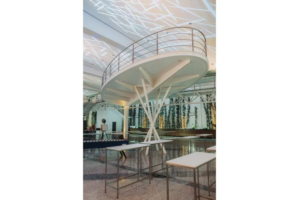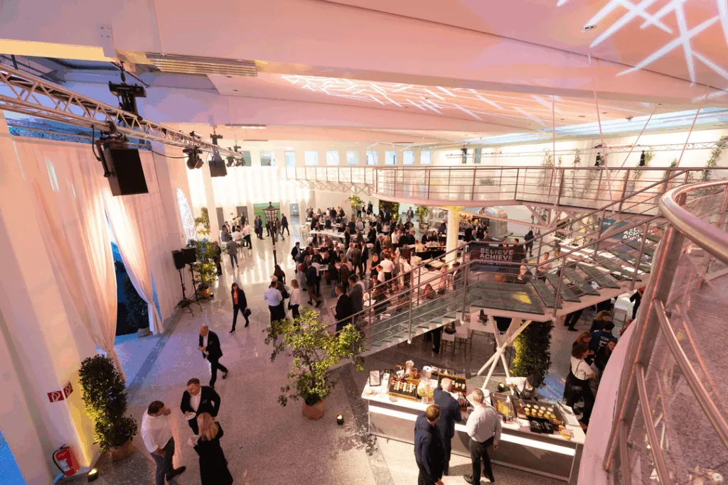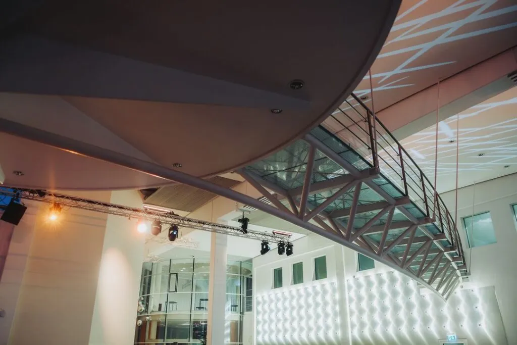 Erleben Sie eine Event Location, die mit modernem Design, neuester Technik und beeindruckender Flexibilität überzeugt. Das Atrium begeistert mit seiner offenen Gestaltung und einer zentralen Treppenanlage, die den Raum in vielseitige Bereiche unterteilt.